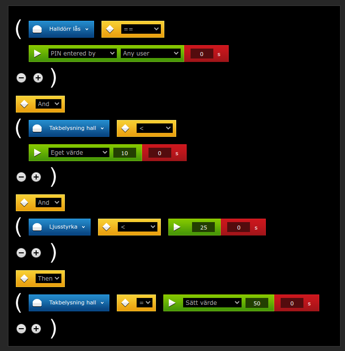 Jag visade ej heller upp scriptet för att tända upp belysningen i hallen när man kommer hem. Detta är gjort som en block scene och ser ut som följer: